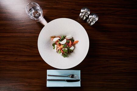 top view of delicious restaurant salad with cheese served in white plate on wooden table with water, cutlery and salt and pepper shakers
