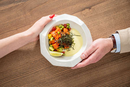 Raw fish poke bowl with sauce