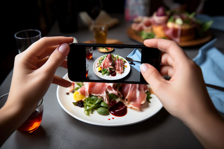 A woman photographs food on the phone in a restaurant. Close-up of hands