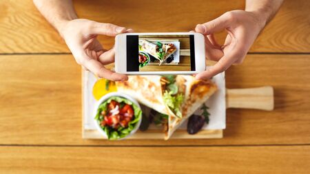 Lunch Time. Guy sitting at table taking photos of kebab on smartphone top view close-up blurred background