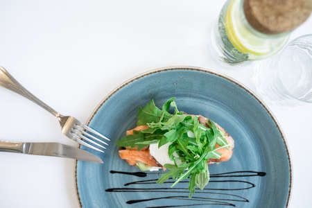 healthy food, tos with slightly salted fish and poached egg, beautiful presentation of the dish