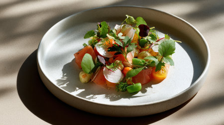 A white plate with a salad on it. The salad is made up of various vegetables and has a nice presentation