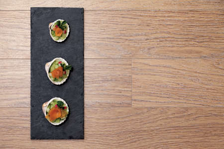 Smoked salmon snacks served in shells, slate plate on wooden background