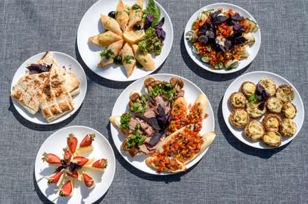 Plates with snacks on servered buffet table at wedding reception outdoors, copy space. Grilled mushrooms with cheese. Sandwiches, appetizer bruschetta, antipast, crostini, tapas. top view, flat lay