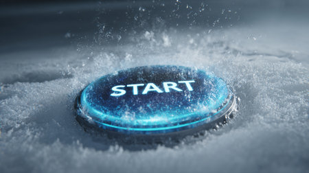 A glowing start button sits amid fresh snow, creating a striking contrast in a cold environment. The scene suggests readiness for an adventure or challenge.