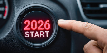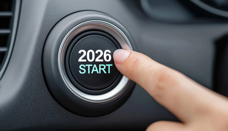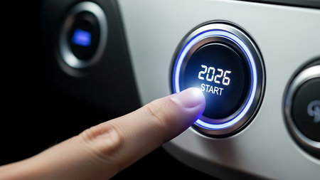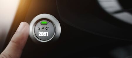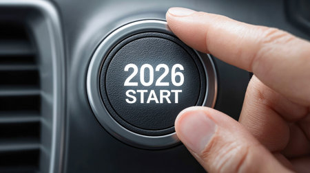 Finger presses the ignition button of a car with the description 2026 Start. Symbol of the beginning of the new 2026 the start of new opportunities.