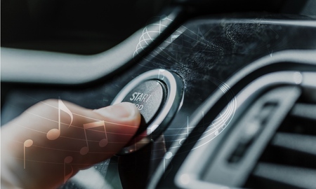 Illuminated Start Engine Button with Activation Switch on Black Textured Surface, Auto Technology