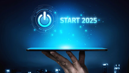 Start 2025 concept with futuristic power button symbolizing fresh beginnings, innovation, and digital transformation. New goals and initiative.