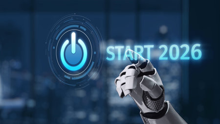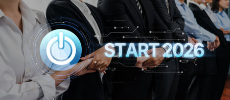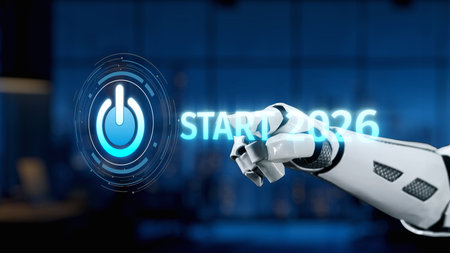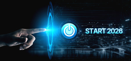 Start 2026 concept with futuristic power button symbolizing fresh beginnings, innovation, and digital transformation. New goals and initiative.