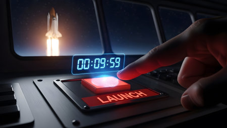 Finger pressing a red launch button on a space mission control panel with digital displays