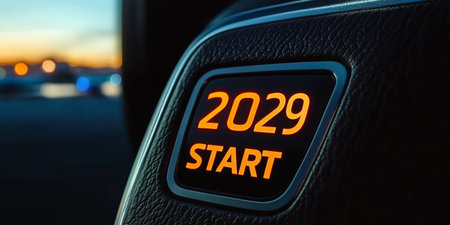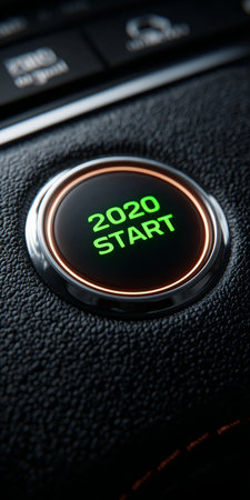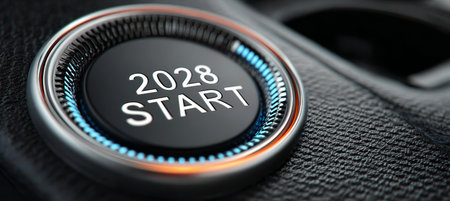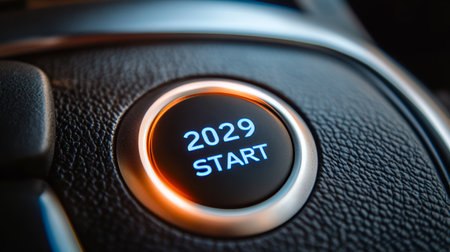 Futuristic Start Engine Button with Illuminated Display Showing Year 2028 for Innovative Vehicles