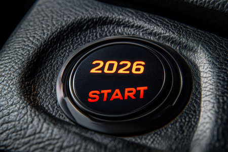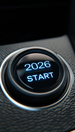 Illuminated Start Engine Button with Blue 2026 Text on Black Leather Surface for Future Innovation