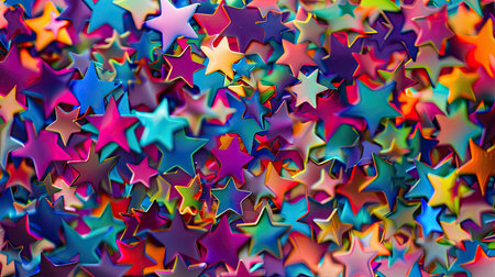 A delightful array of glittering stars in pink, green, and copper hues creates a festive and cheerful atmosphere. This image captures the essence of celebration, perfect for holiday-themed projects or creative designs.