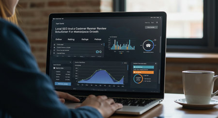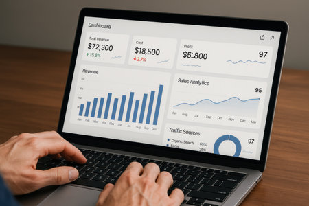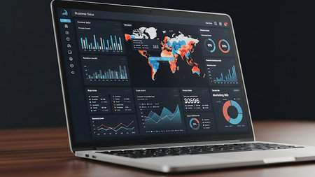 Close-up of a laptop screen displaying a business analytics dashboard, with data and charts.
