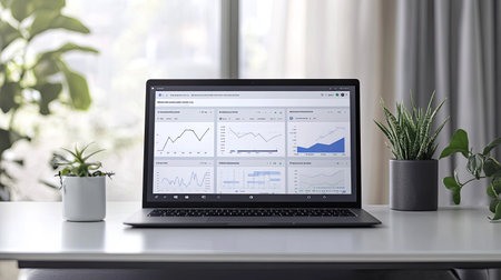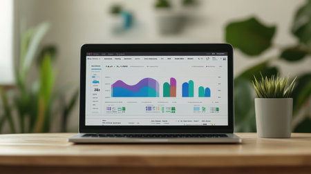 A sleek laptop shows vibrant data visualizations on its screen, surrounded by a serene workspace setting with a green plant, ideal for business and analytics projects.