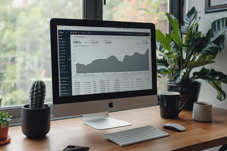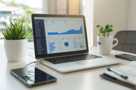 A stylish workspace featuring a laptop with a dynamic graph display, surrounded by green plants and a smartphone, perfect for illustrating business or technology themes.