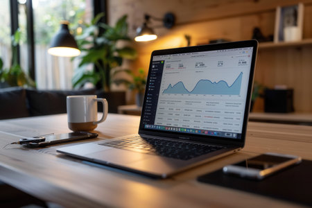 A sleek home office features a laptop displaying financial charts, accompanied by a smartphone, documents, and a steaming cup of coffee.
