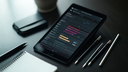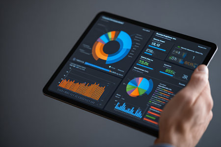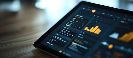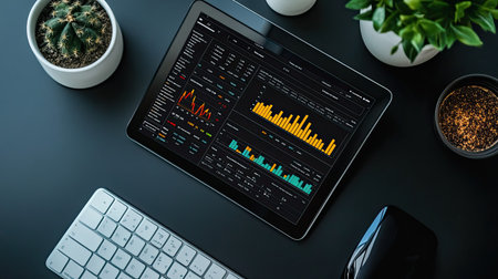 A sleek data dashboard showcasing various analytics and performance metrics. The design features graphs and charts displayed on a tablet, enhancing productivity.