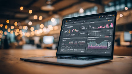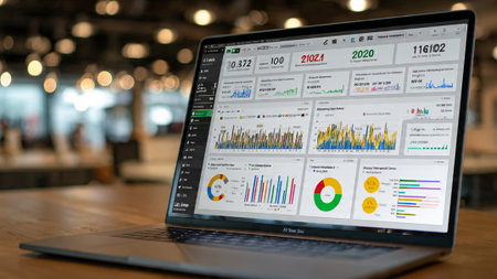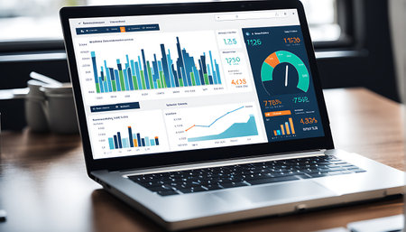 Close-up of a laptop screen with a dashboard displaying various graphs and charts, highlighting data visualization