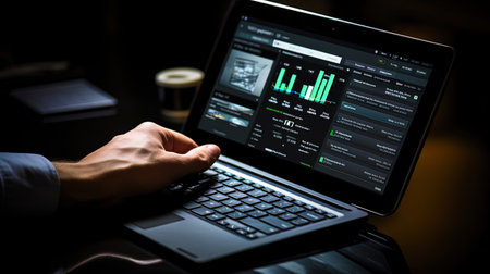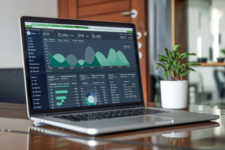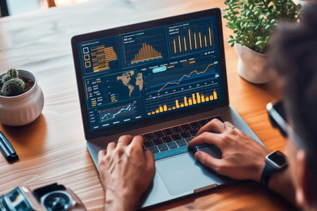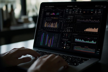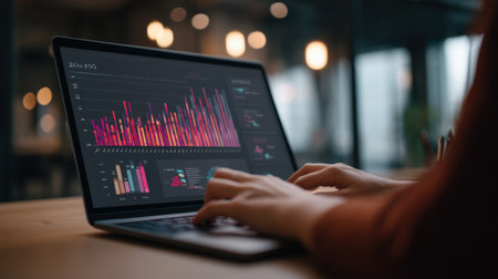 Person is analyzing data on laptop, showcasing colorful graphs and charts on screen. workspace is modern and well lit, creating focused atmosphere for data analysis