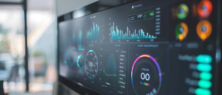 A focused shot of a large screen featuring realtime data visualization tools showcasing interactive segments filled with KPIs and metrics. The screen highlights areas of performanc