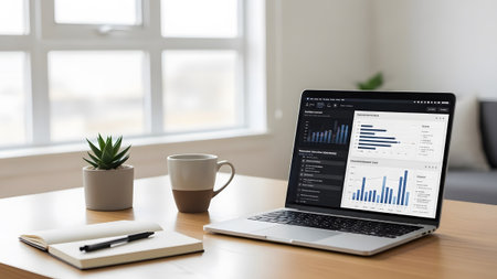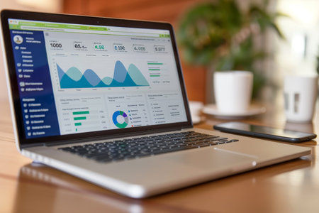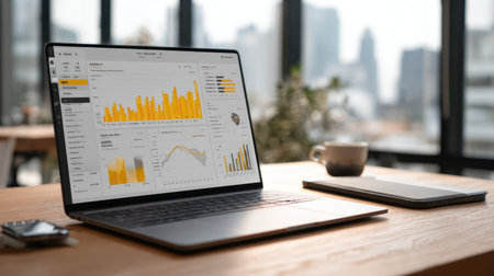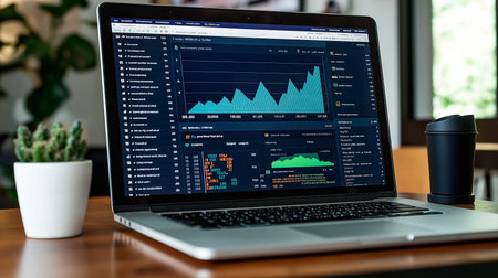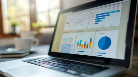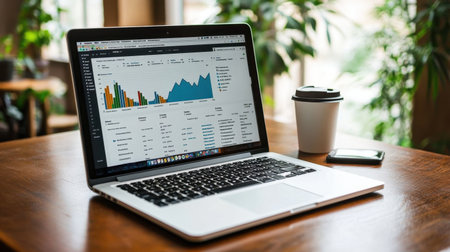 A modern laptop on a wooden table showcases analytical graphs and statistics in a bright office. A coffee cup and smartphone complement the organized workspace.