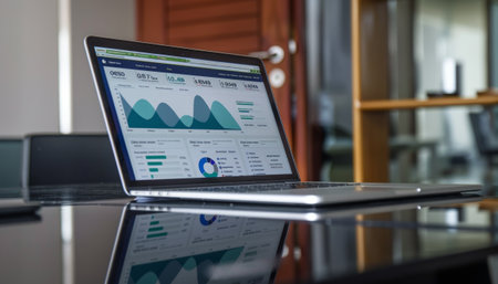 Laptop displaying graphs and charts sits on a desk, reflecting the surrounding office environment