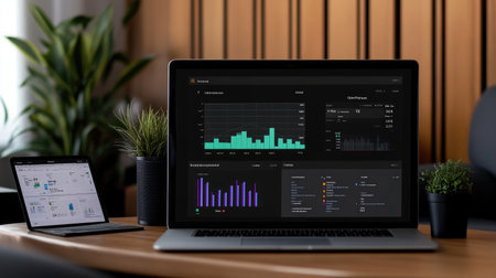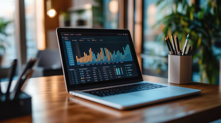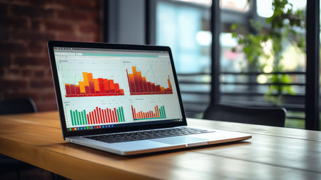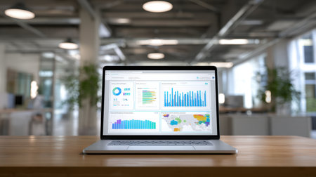 A modern laptop sits on a wooden desk, showcasing colorful data visualizations and graphs in a bright, open office space that encourages creativity and collaboration.