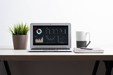 Laptop with graph chart report screen on work table. Home office or work space. Strategy analysis financial accounting concept