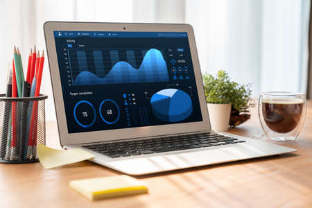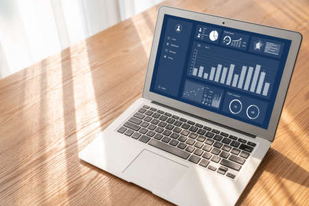 Top view finance dashboard data display on laptop screen with analyzed chart for marketing indication.