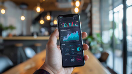 A hand holding a smartphone with a business analytics app open, displaying real-time business graphs and performance metrics for decision-making.