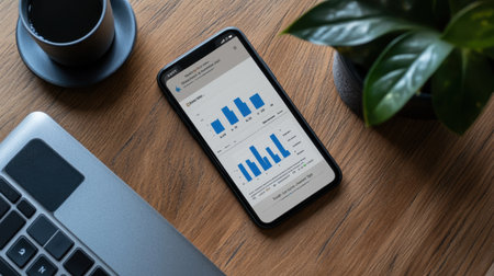 A top view of a smartphone displaying vibrant graphs and charts on a wooden table, accompanied by a laptop and a green plant, perfect for conveying business analytics.