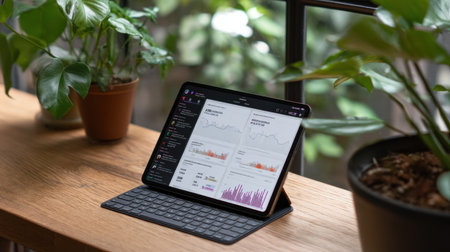 A tablet is on a wooden table with a potted plant in the background. The tablet is displaying a graph and a keyboard. Scene is calm and focused, as the tablet is being used for work or study purposes