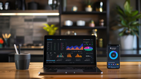 A detailed shot of a smart home dashboard monitoring energy and water usage, illustrating technology-driven sustainable living,