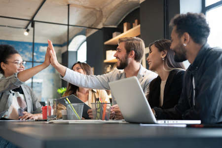 Two cheerful young business people giving high-five while their colleagues looking at them and smiling.