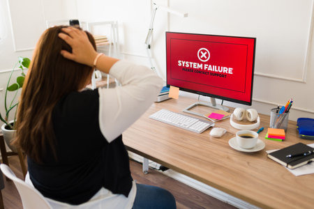 Embracing Failure Laptop on Wooden Table with Neon Failure Sign in Blurred Office Background