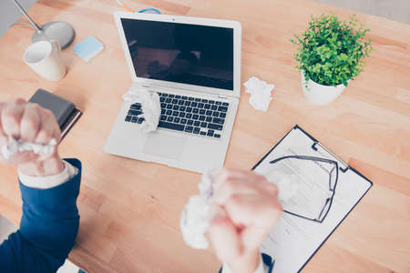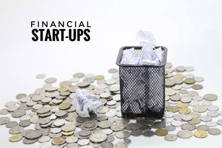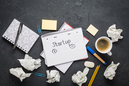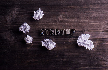 Office desk with start up sign made of cookie cutters and crumpled paper balls. Flat lay. Workplace. Studio shot on wooden background.