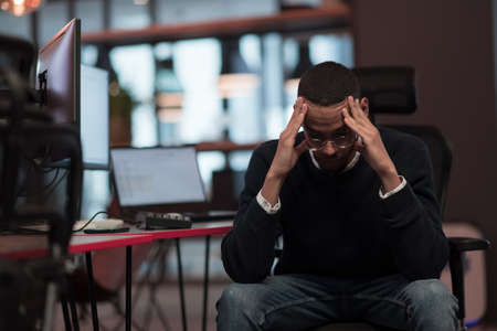 Man in blue t shirt feel a despair while working an overtime at light office.