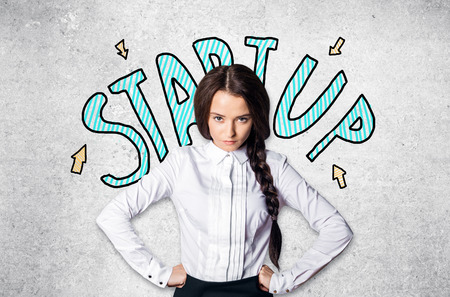 Portrait of determined caucasian girl on concrete background with start up sketch. Startup concept