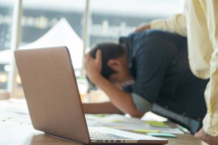 Boss and executive team feeling stress and serious of fail business, partners holding heads in hands depressed by failure and exhausted with problems with a pile of work.