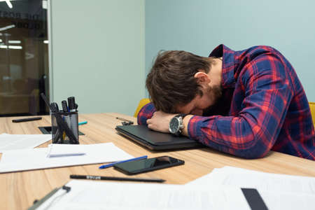 Overworked tired manager sleeping on the desk after a hard day at work. Tired man falls asleep in the workplace. Business startup and entrepreneurship concept.