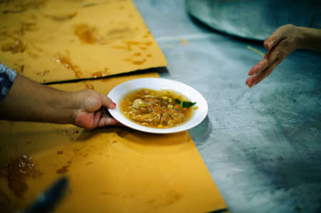 hand giving soup bowl needy person. Resolution and high quality beautiful photo