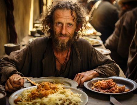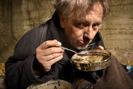 Ugly pauper man living outdoor preparing and eating lentil soup