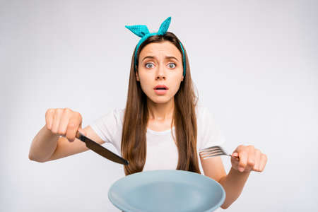 Close-up portrait of her she nice attractive depressed hungry girl holding in hands fork knife crockery want edible useful ingredients empty plate isolated over light white color background