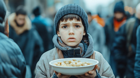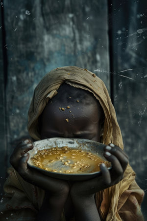 A young African boy gazes with profound sadness, holding an empty bowl near his face, conveying a poignant story of hunger and longing illuminated by soft natural light.