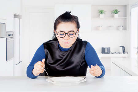 Fat woman eating with empty plate while sitting in the kitchen at home