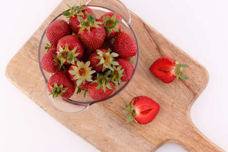 Fresh ripe cut strawberries and in a white porcelain bowl on a wood cutting board on marble white table.