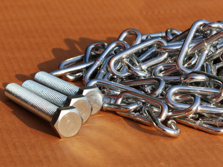 chrome chain and fasteners close-up scattered on the surface of the background for the magazine
