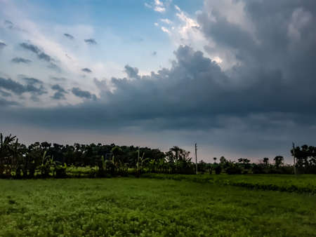 Farmland and sunlight in rural India at sunset, images of black clouds in the red sky.