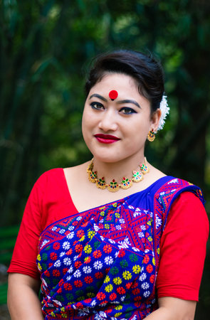girl smiling face isolated dressed in traditional wearing on festival with blurred background image is taken on the occasion of bihu at assam india.